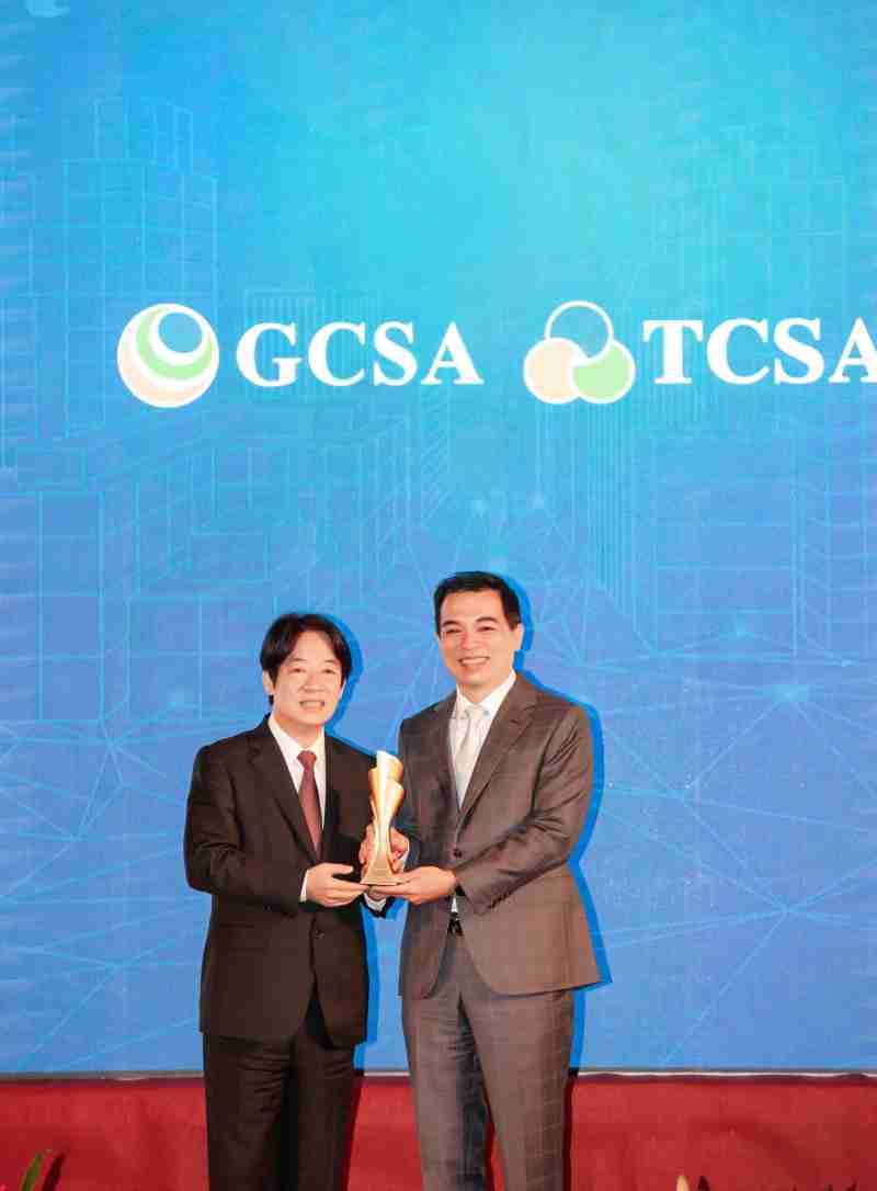 达全方位永续表现获全球永续奖及台湾永续奖肯定,,由副总统赖清德颁奖 (左),,开云电子总经理柯富仁 (右) 代表领奖