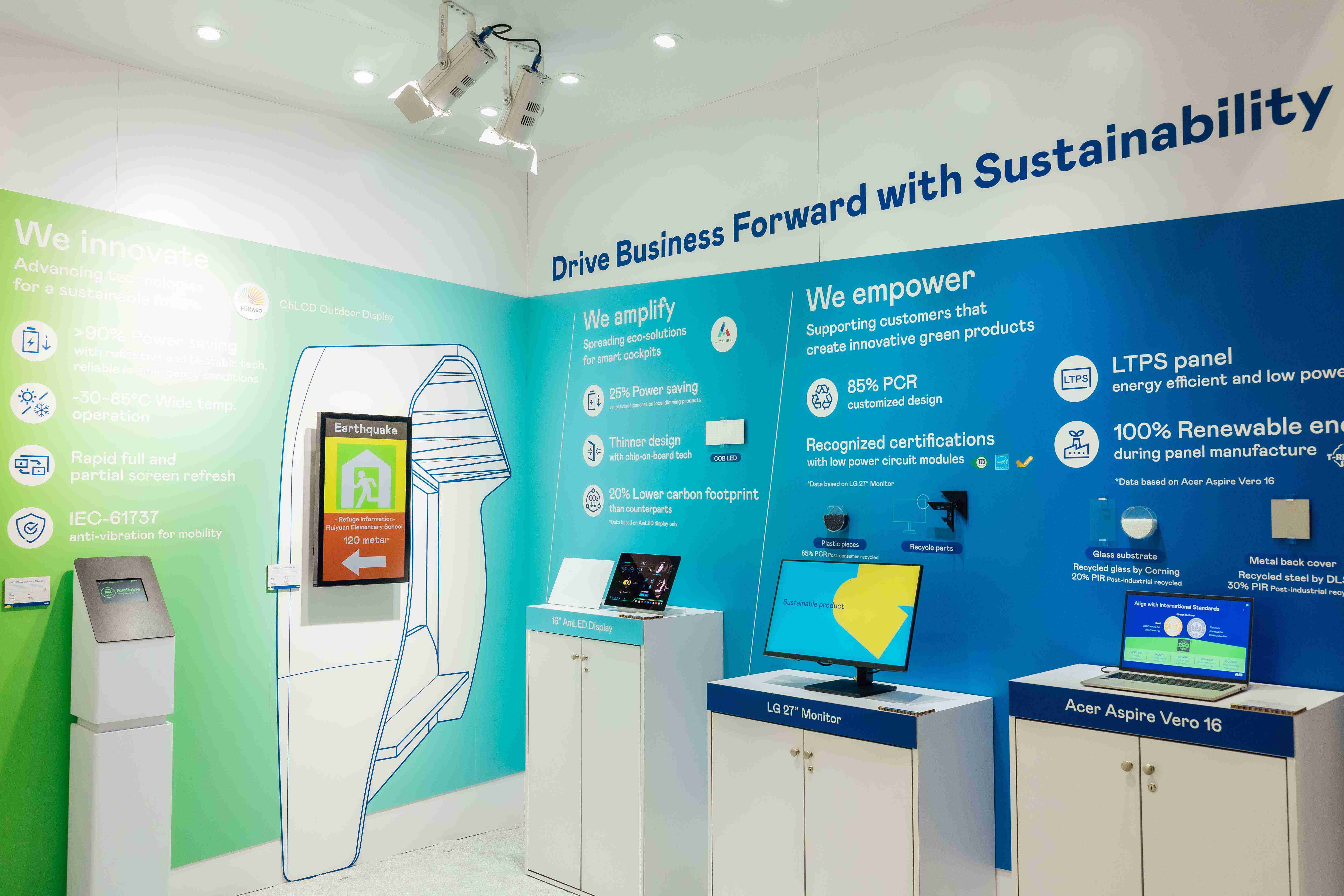 开云电子运用创新显示技术HiRaso胆固醇液晶双稳态技术达到显示零耗能、、、、扩大节能省电的AmLED显示技术应用于车用产品、、、以再生的消费后回收(PCR)塑料及全绿电生产之面板,,应用于笔电及萤幕,,增加绿色价值。。。