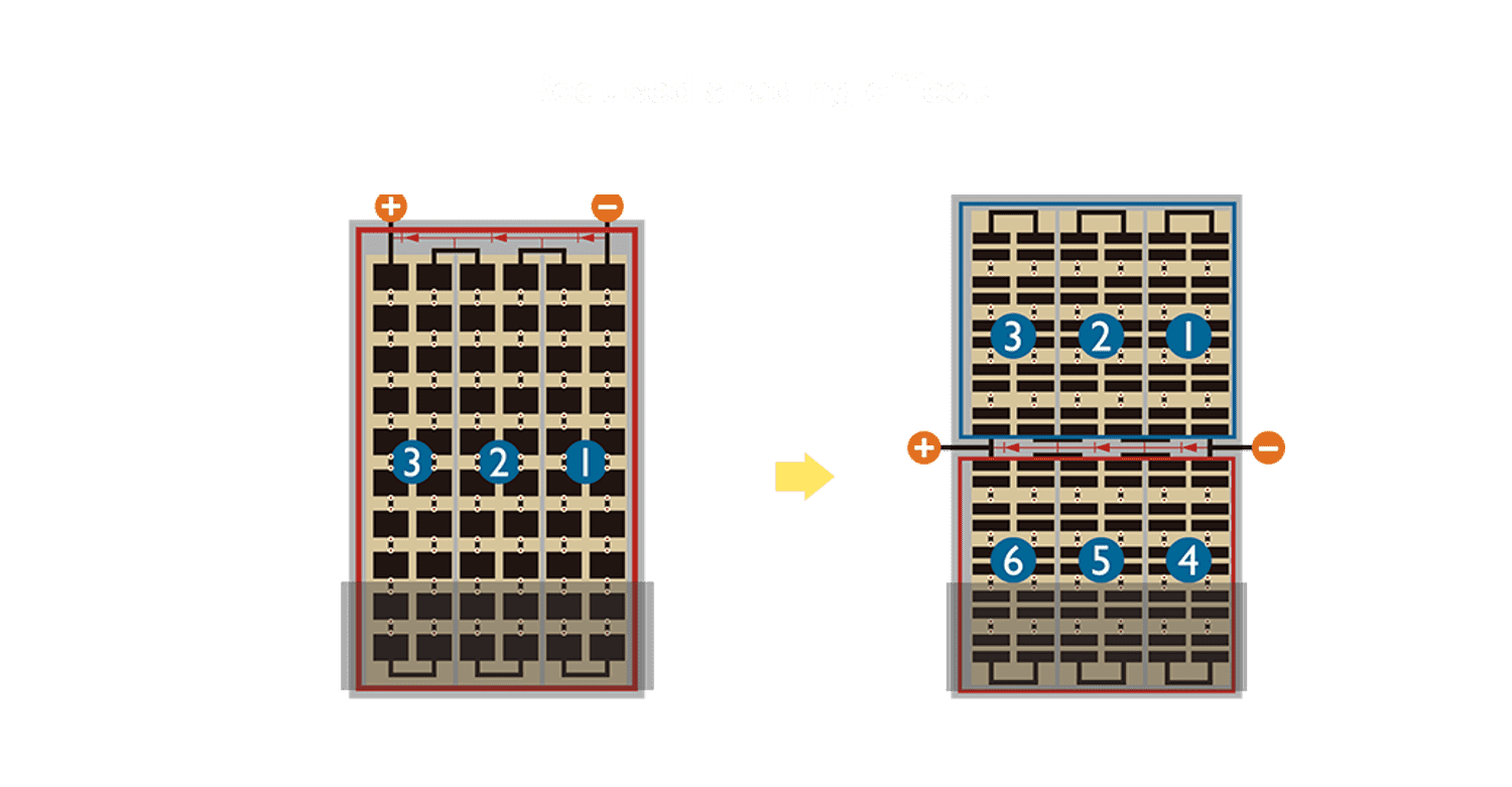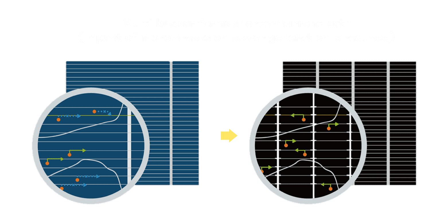 - 电池使用多条铜导线 (Copper wire) 于电池片上形成较短的电流路径,,,,提高电流收集效率,,,,采用圆形设计的铜导线较传统扁平式的铜焊带 (Ribbon),,可增加入射至电池的光线量。。。。