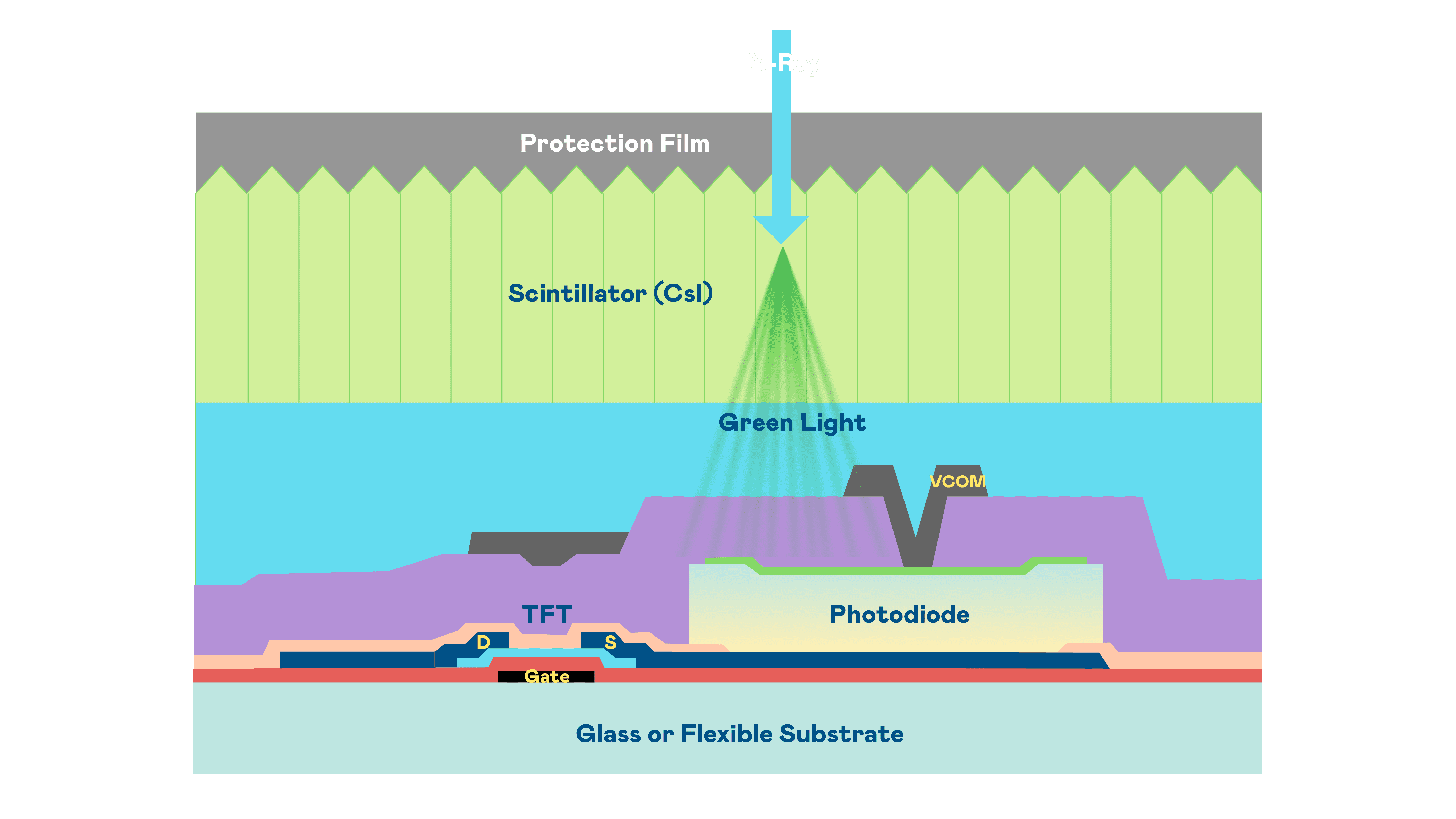 开云电子的X光影像感测阵列使用薄膜电晶体 (TFT) 作为每个像素的读取开关,,,搭配光电二极体(Photodiode)的光电转换元件,,用以感测X光影像讯号。。。。
